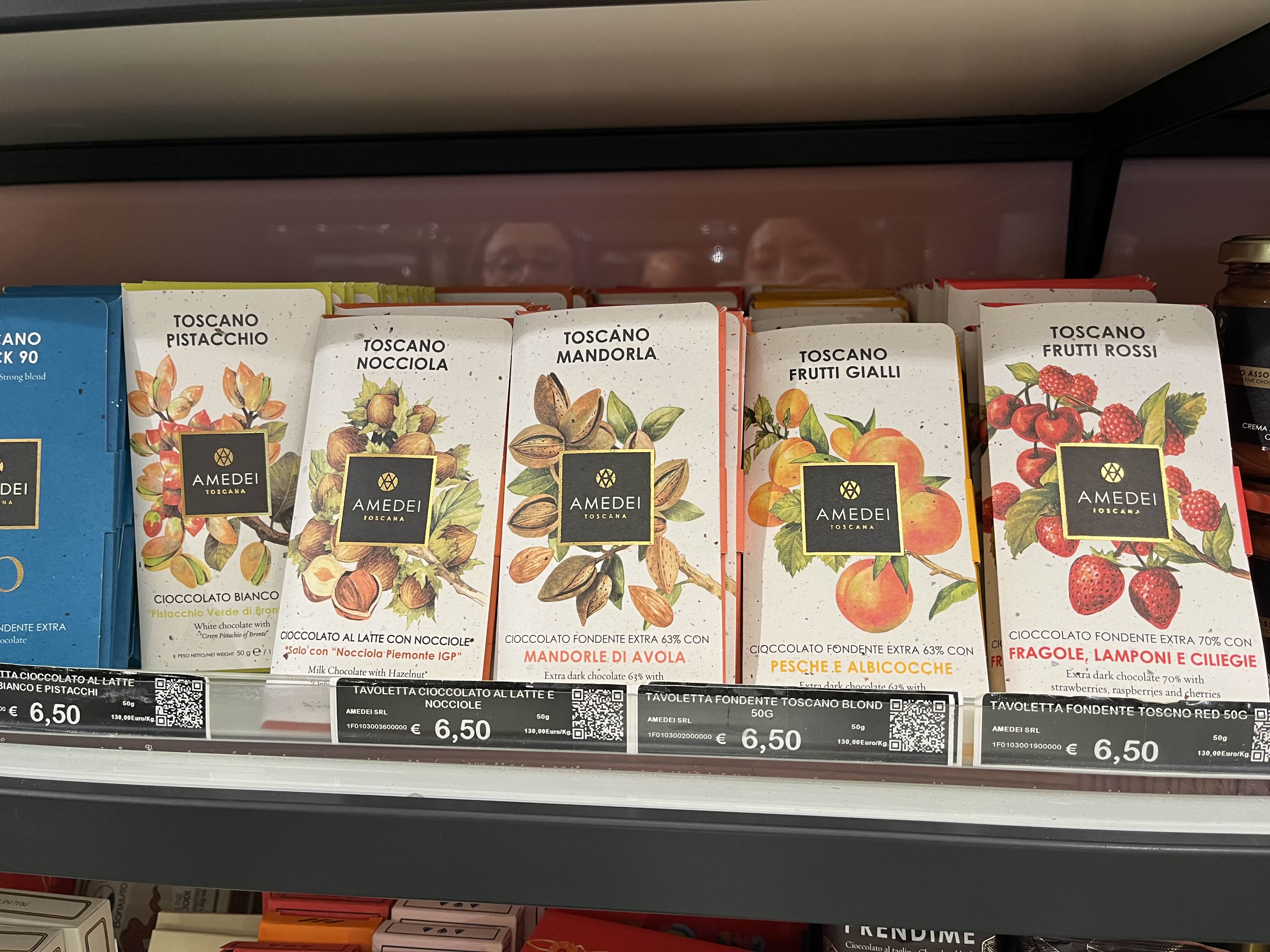 아메데이 초콜릿은 이탈리아를 대표하는 프리미엄 초콜릿으로 초콜릿계 샤넬이라고도 부릅니다. 고급 호텔에서 볼 수 있는 아메데이 초콜릿은 이탈리아 현지에서 다양한 제품들을 만나볼 수 있고 패키지가 예뻐서 선물하기에도 좋습니다. 견과류와 과일이 든 초콜릿, 다크초콜릿 등 종류가 많으니 취향껏 선택해 보세요.