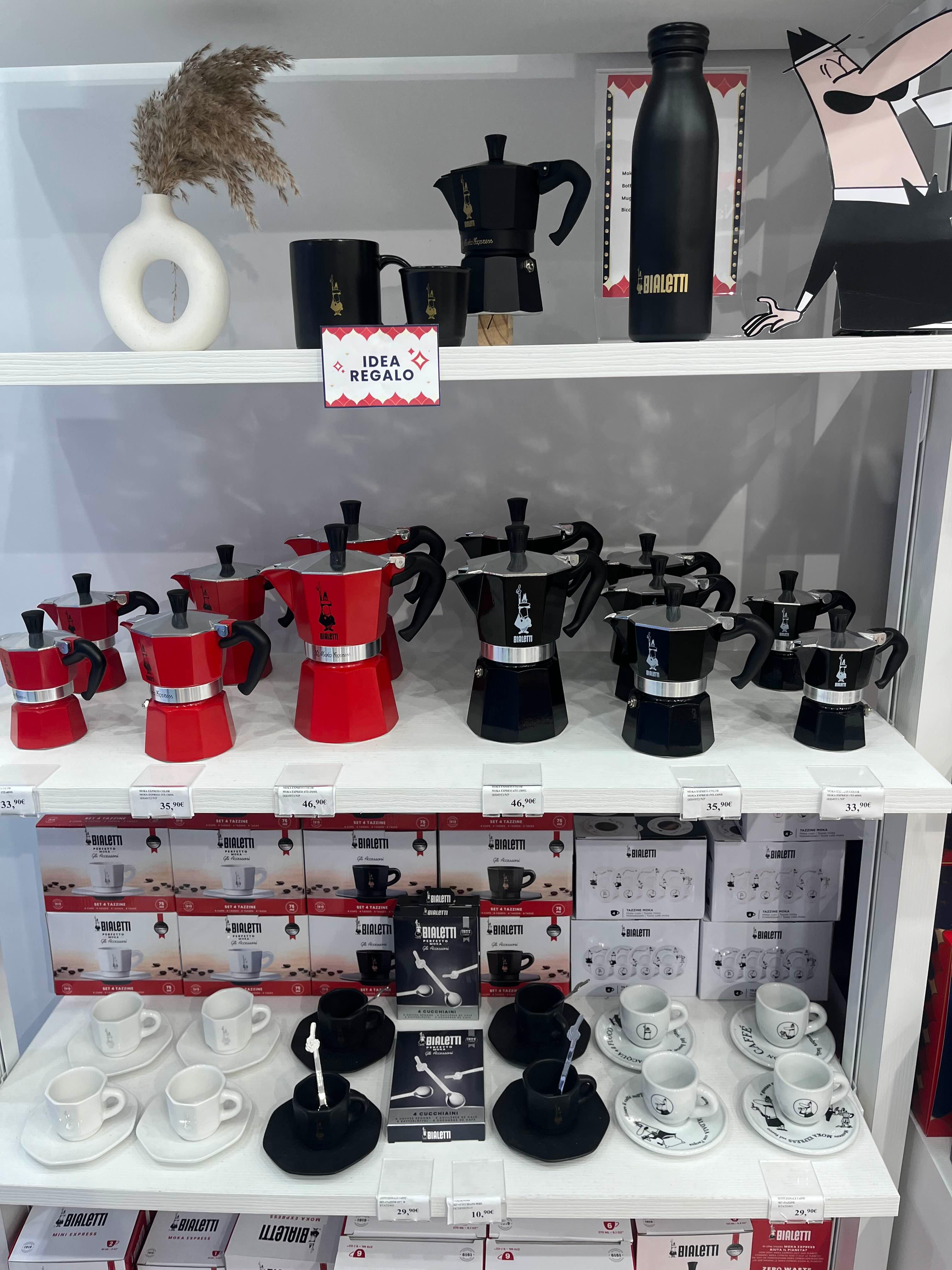 모카포트는 집에서도 쉽게 커피를 만들 수 있는 커피 추출 기구로 이탈리아 비알레띠 매장을 가시면 한국보다 다양하고 예쁜 제품들이 있습니다. 그리고 현지에서는 콜라보 제품들도 직접 보실 수 있어 들러보면 좋을 거 같아요. 제가 갔을 때는 맥킨지 콜라보 제품이 있었습니다. 커피 좋아하시면 모카포트도 구경하시고 모카포트용 원두도 함께 구입해 보세요. 기념품이나 선물용으로 좋습니다.