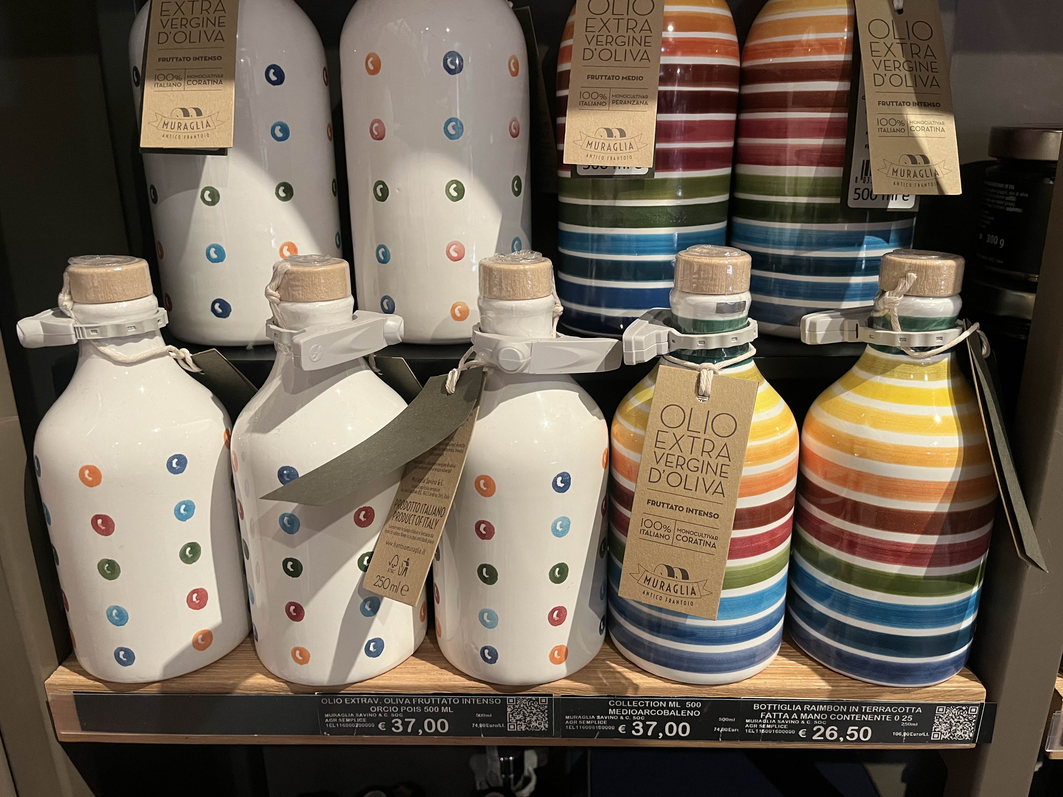 이탈리아의 DOP 올리브 오일은 최고급 품질을 의미합니다. DOP는 생산지역, 품질 기준을 엄격히 관리받은 올리브 오일에만 붙여지는 인증으로 이탈리아 여행 시 기념품이나 선물로 구입하시면 좋습니다. 그리고 수작업한 도자기병에 담아낸 무랄리아 올리브 오일은 품질도 좋지만 인테리어 소품으로 사용하기에도 좋아 추천드릴게요.