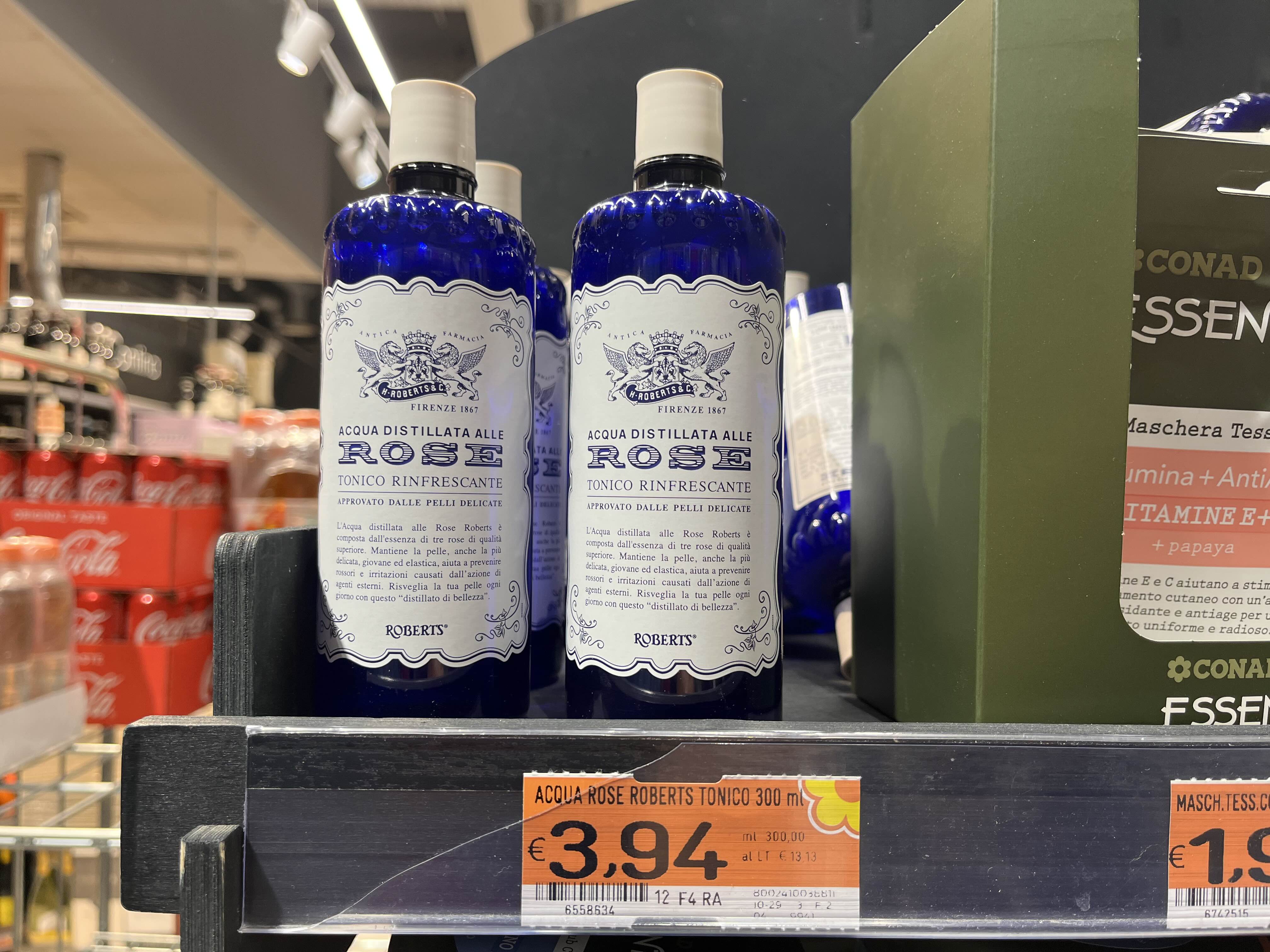 로버츠 약사가 만든 로버츠 장미수는 보습, 진정에 좋아요. 산타마리아노벨라 토너 저렴이 버전으로 유명하며 한국에서 100만병이 팔릴 정도로 인기 상품입니다. 이탈리아 현지에서 저렴하게 구입해서 사용해 보세요.