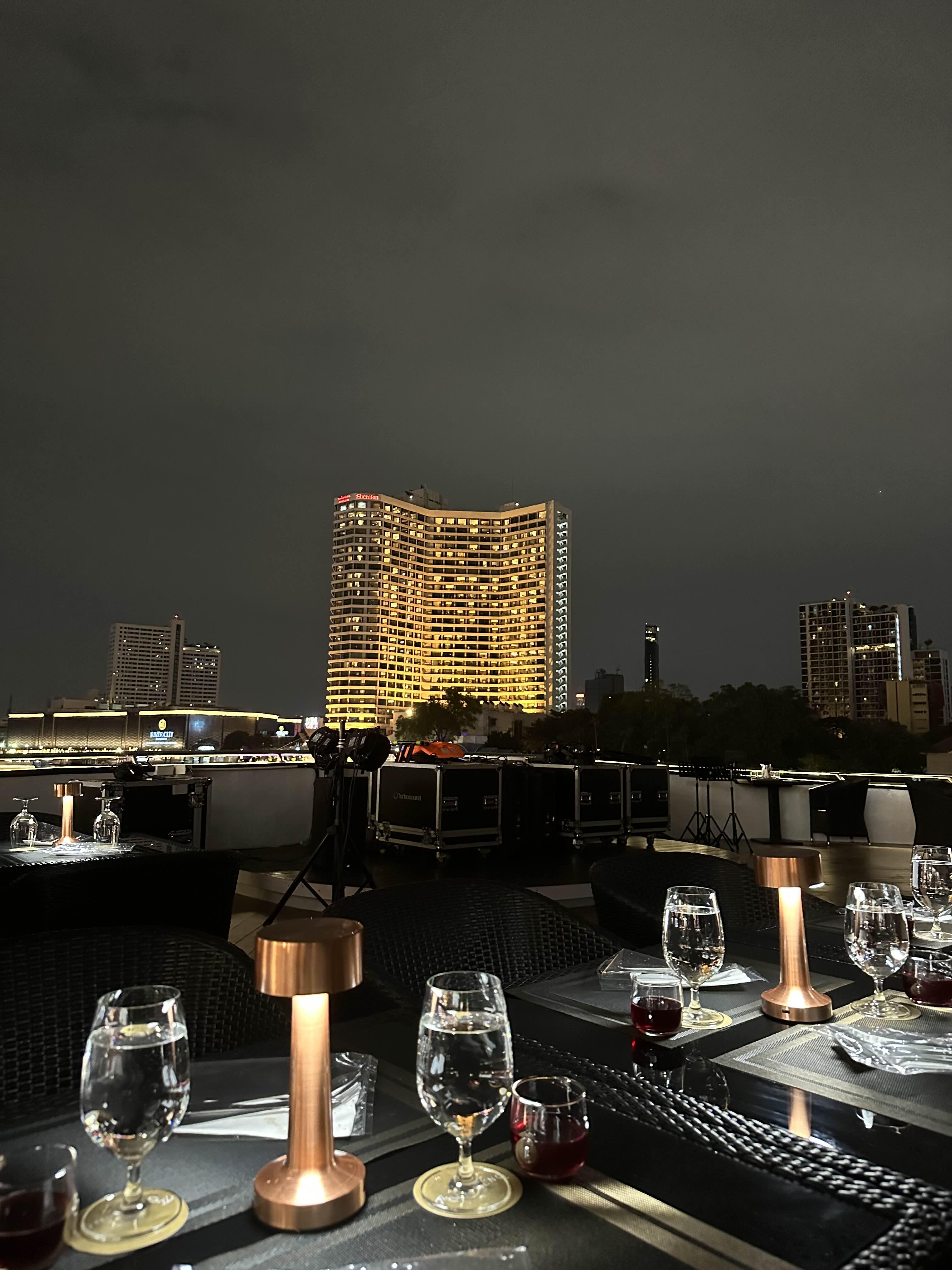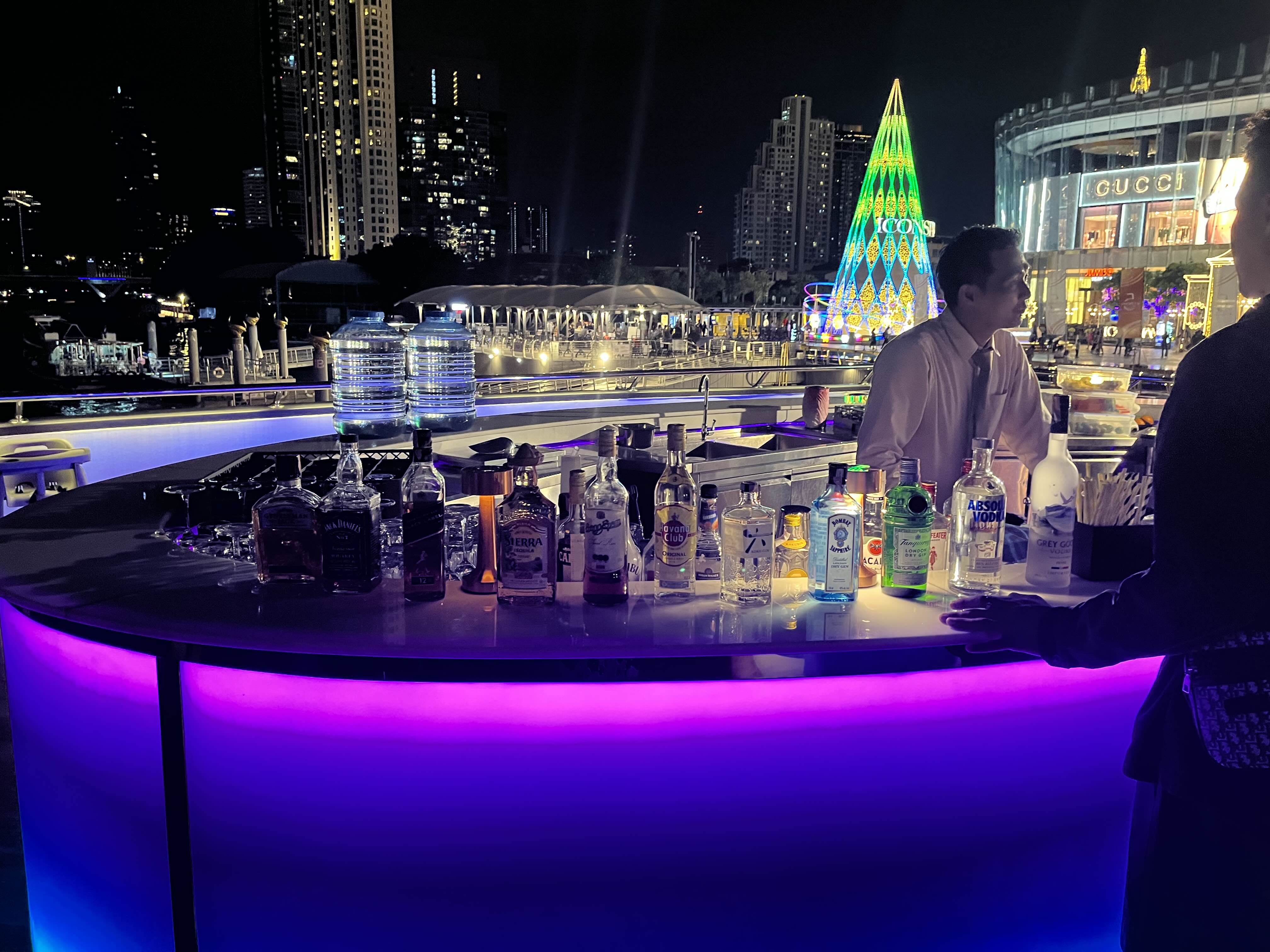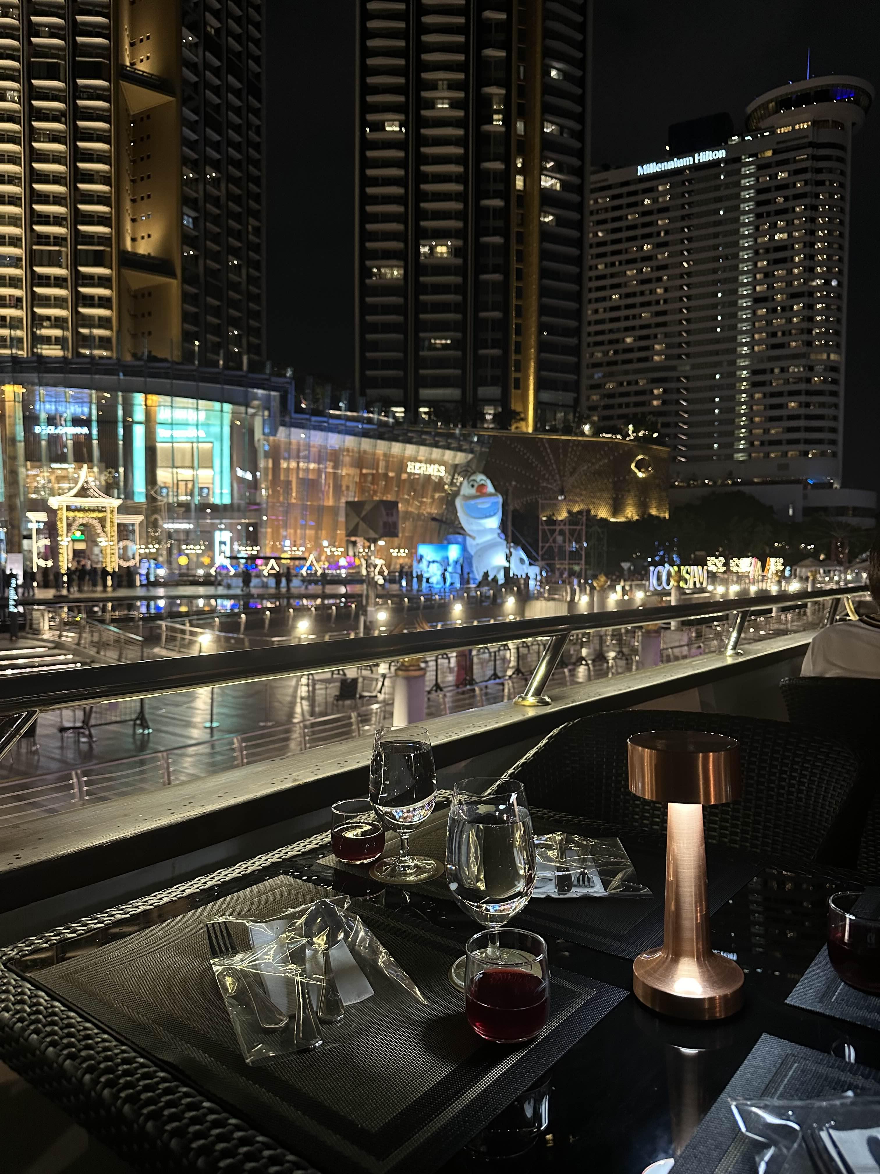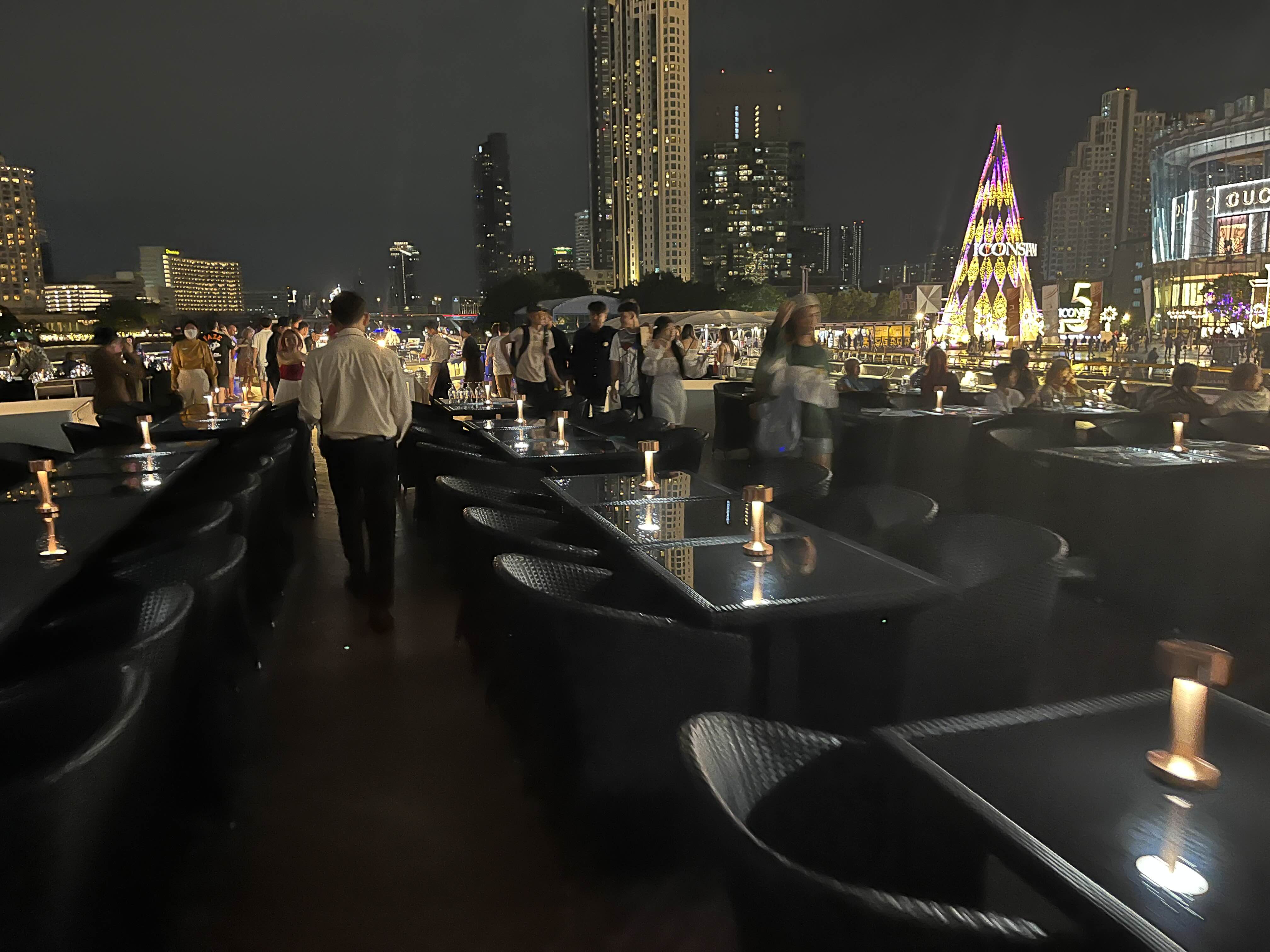 저희가 예약한 실외석입니다. 오픈형이라 야경을 제대로 즐길 수 있었는데요 아직은 예약 손님이 많지 않아서인지 여유가 있었습니다. 좌석마다 터치식 조명도 놓여있어서 어둡다는 느낌은 없었어요. 비가 오는 경우에는 다른 방법이 없고 실내석에 자리가 있는 경우 옮길 수는 있는 것 같습니다. 크루즈에서 보이는 아이콘 시암도 굉장히 멋졌어요.