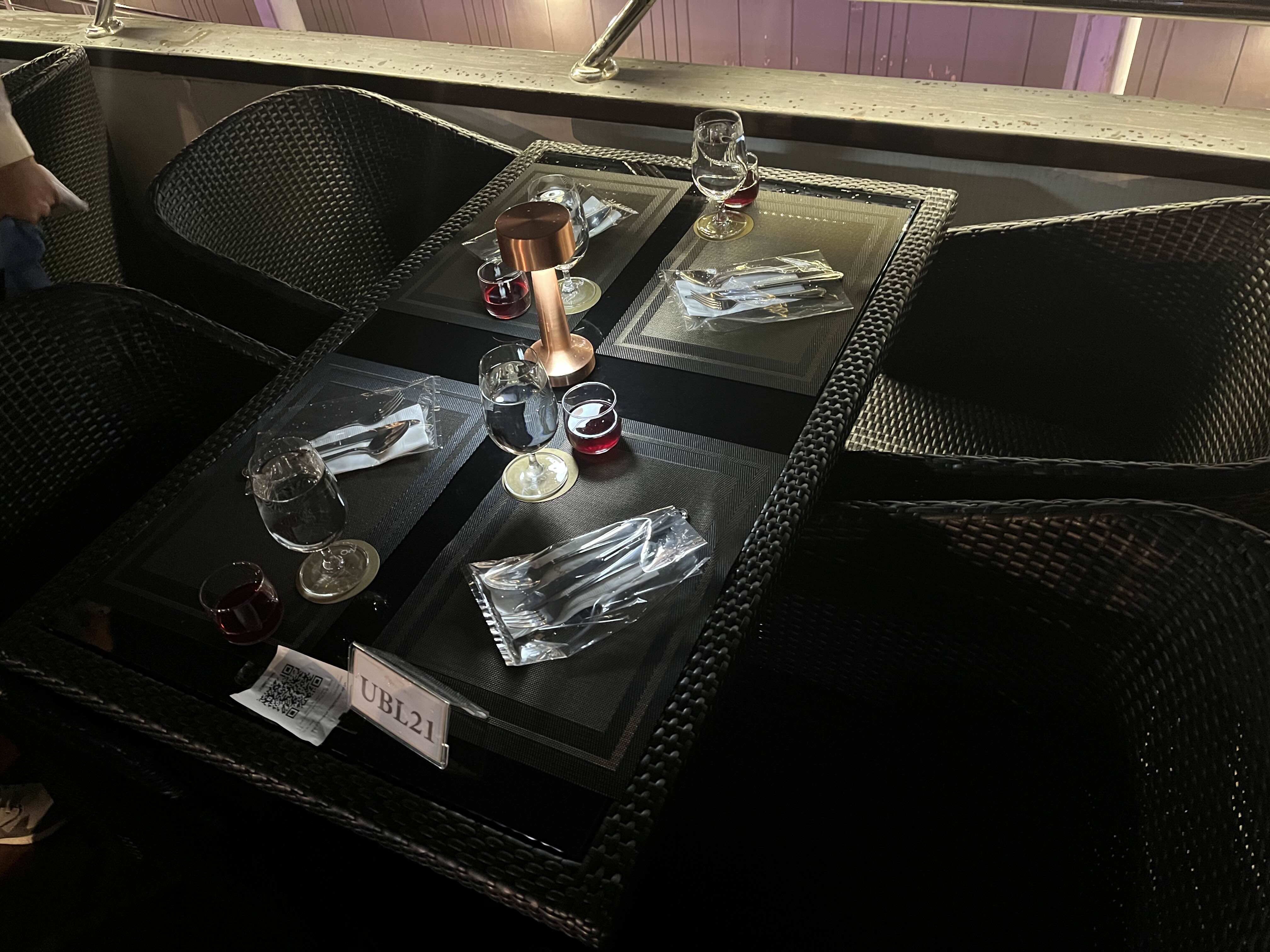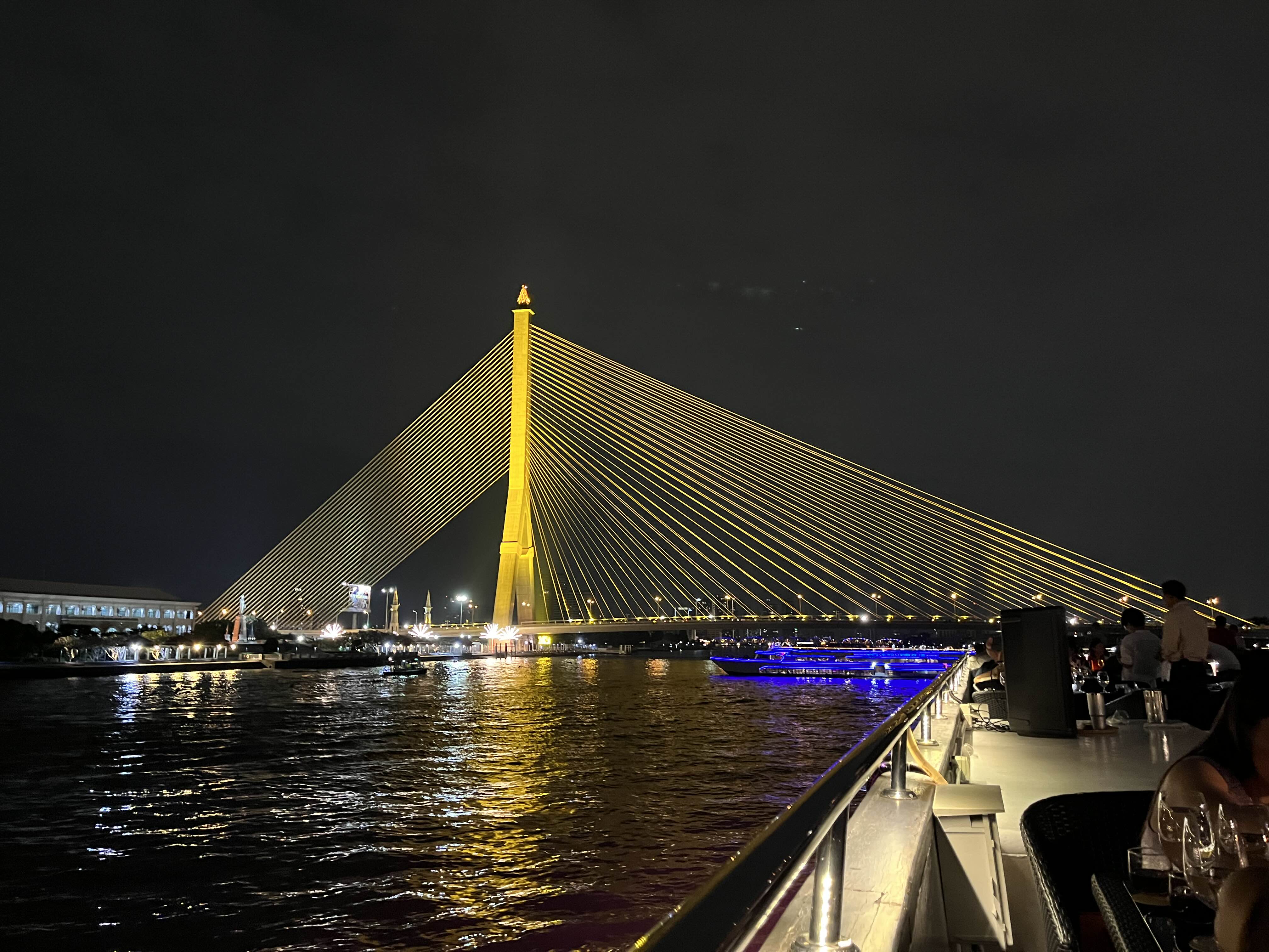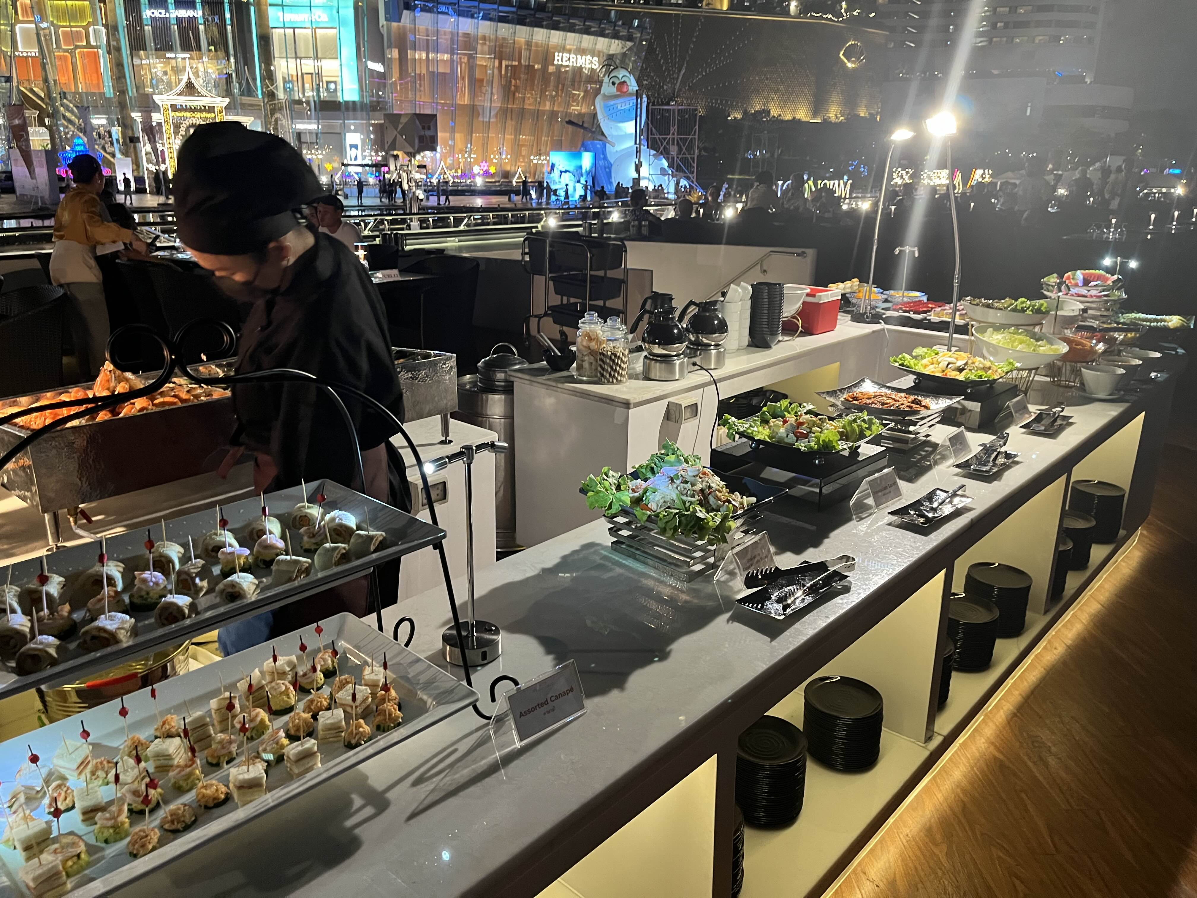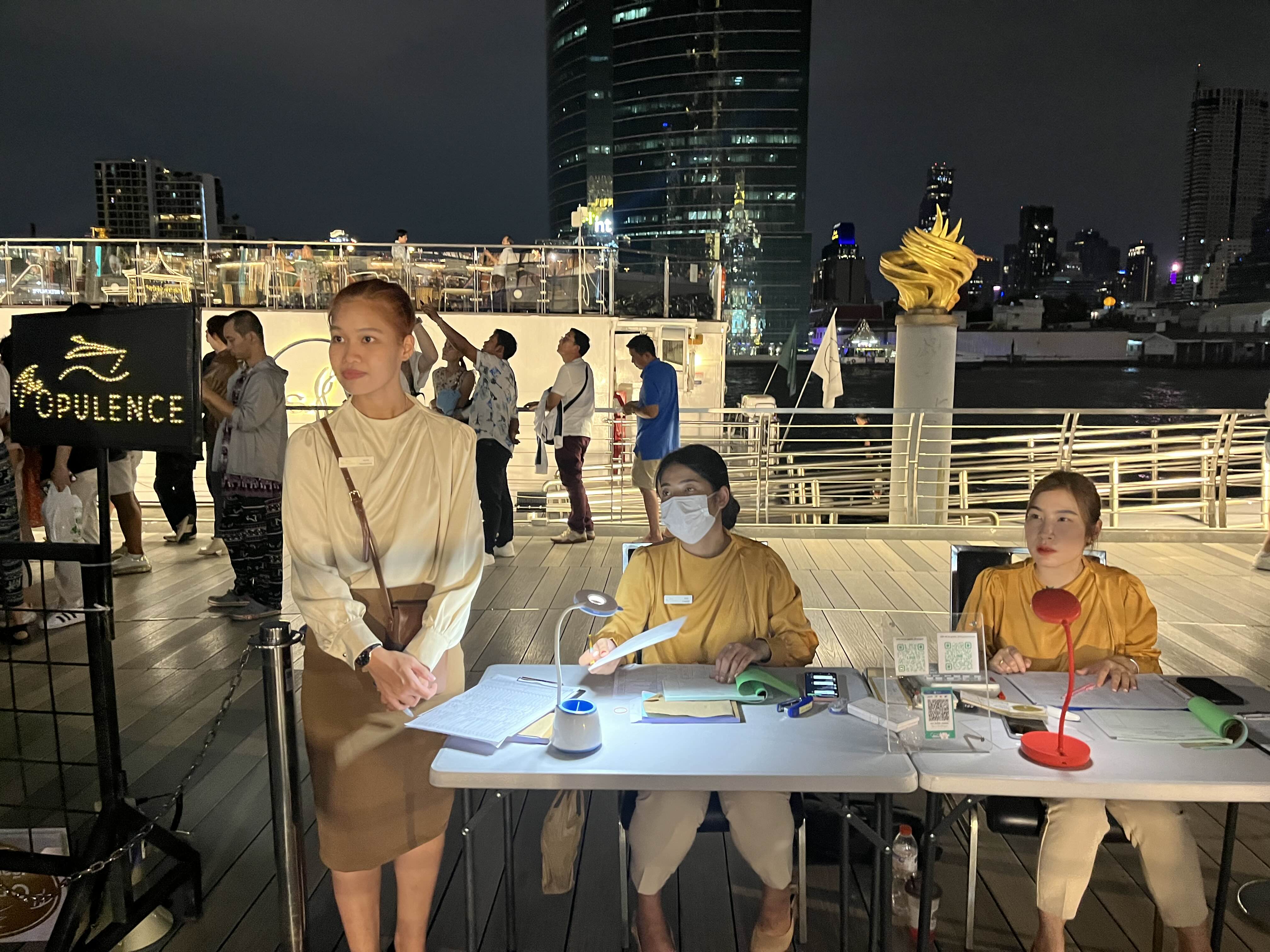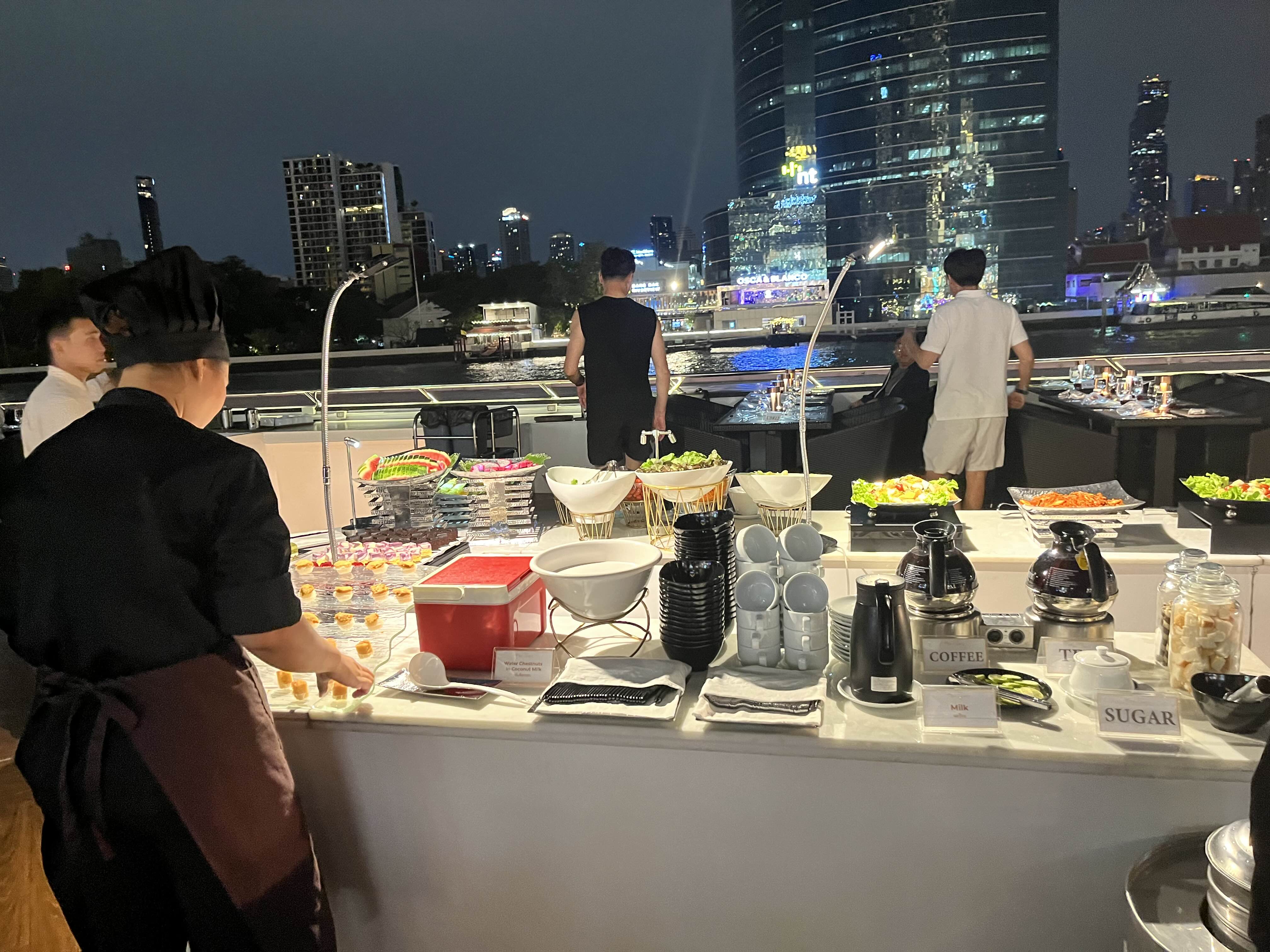 저희가 예약한 실외석입니다. 오픈형이라 야경을 제대로 즐길 수 있었는데요 아직은 예약 손님이 많지 않아서인지 여유가 있었습니다. 좌석마다 터치식 조명도 놓여있어서 어둡다는 느낌은 없었어요. 비가 오는 경우에는 다른 방법이 없고 실내석에 자리가 있는 경우 옮길 수는 있는 것 같습니다. 크루즈에서 보이는 아이콘 시암도 굉장히 멋졌어요.