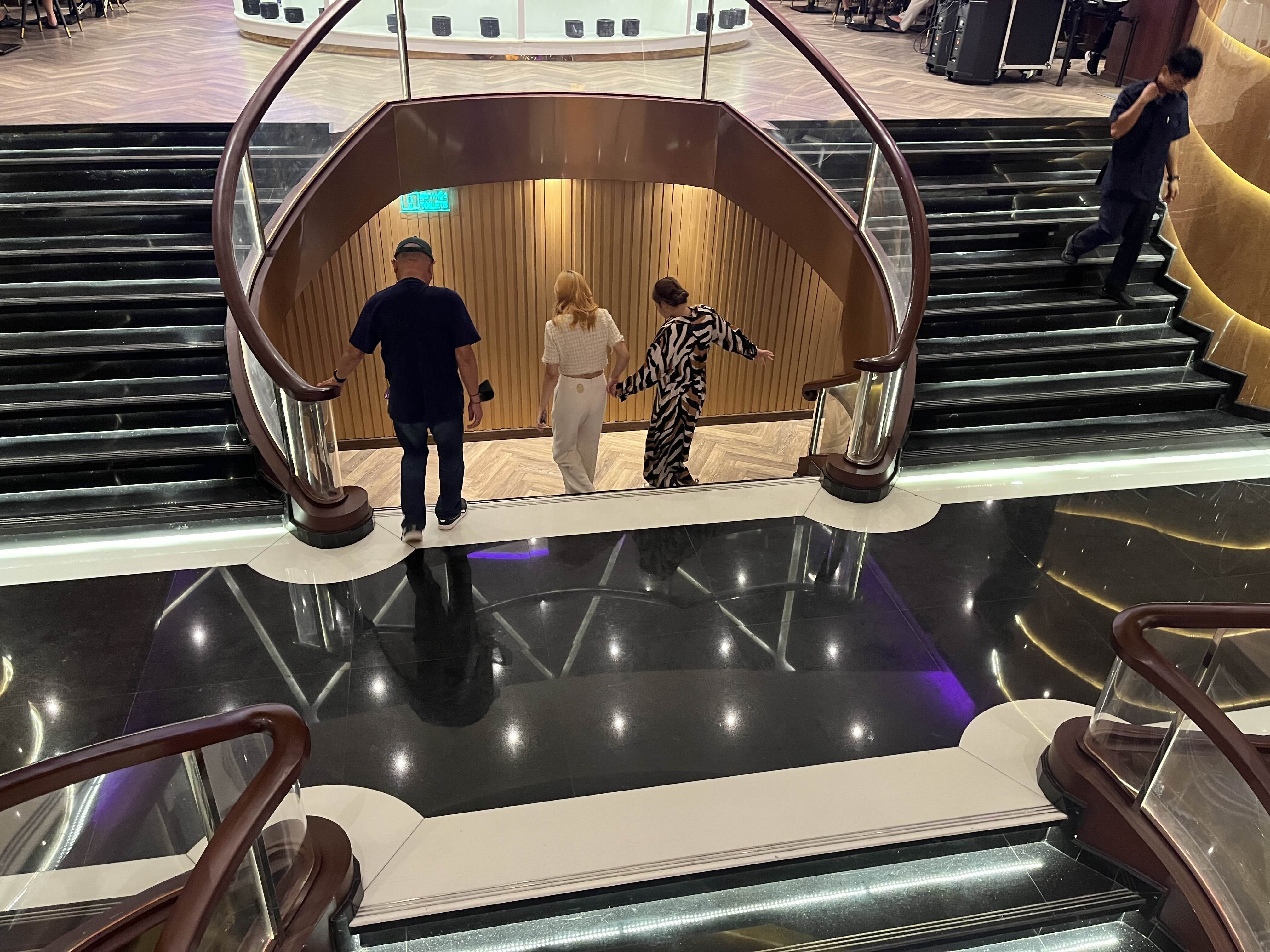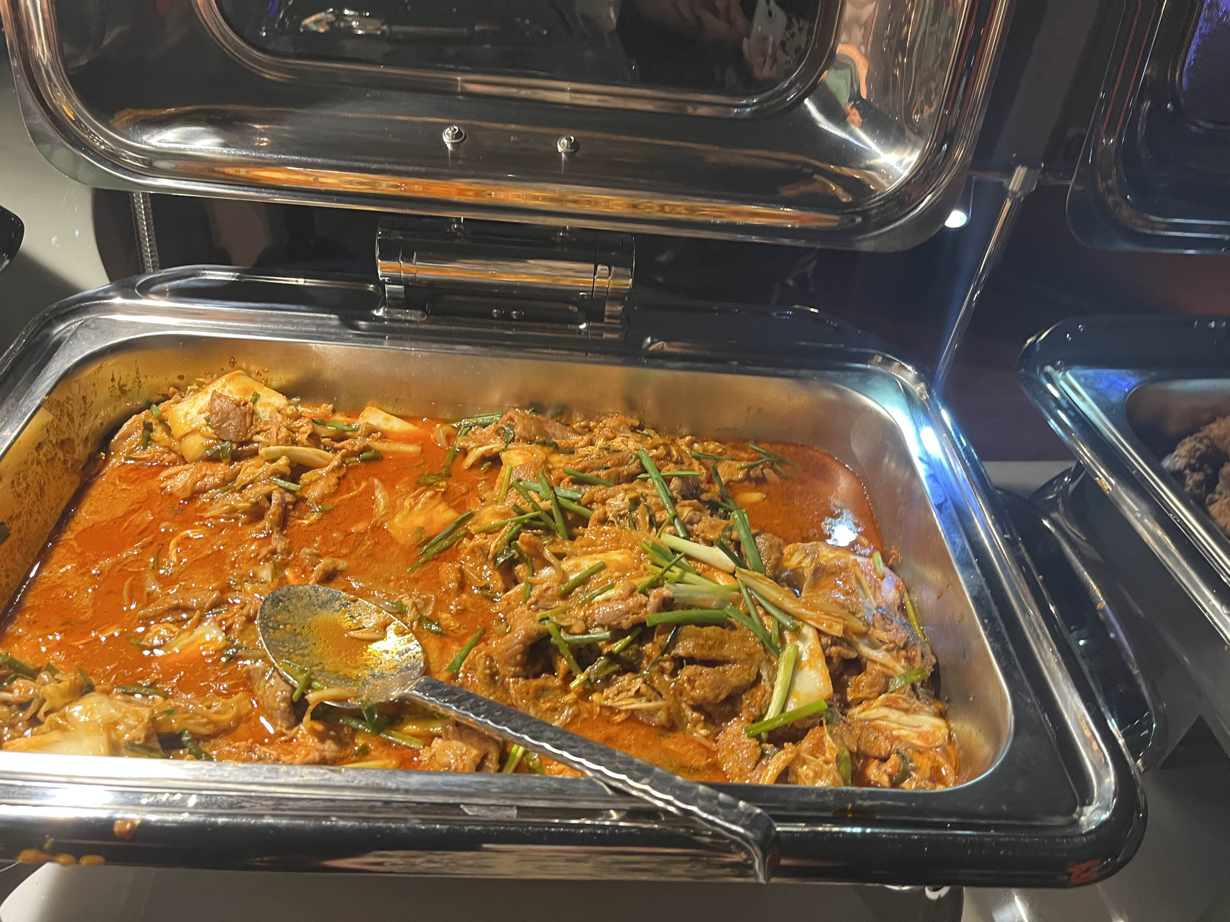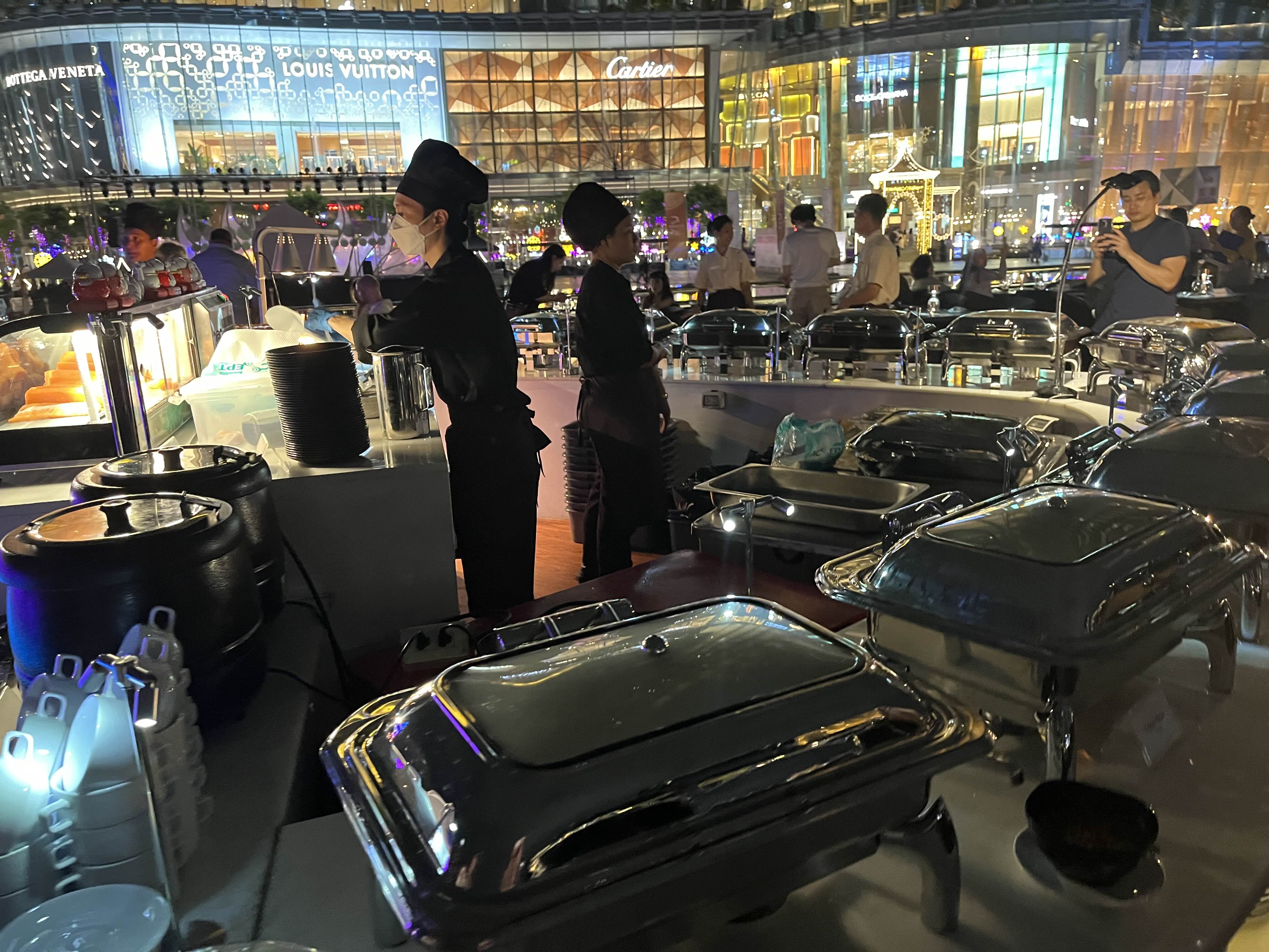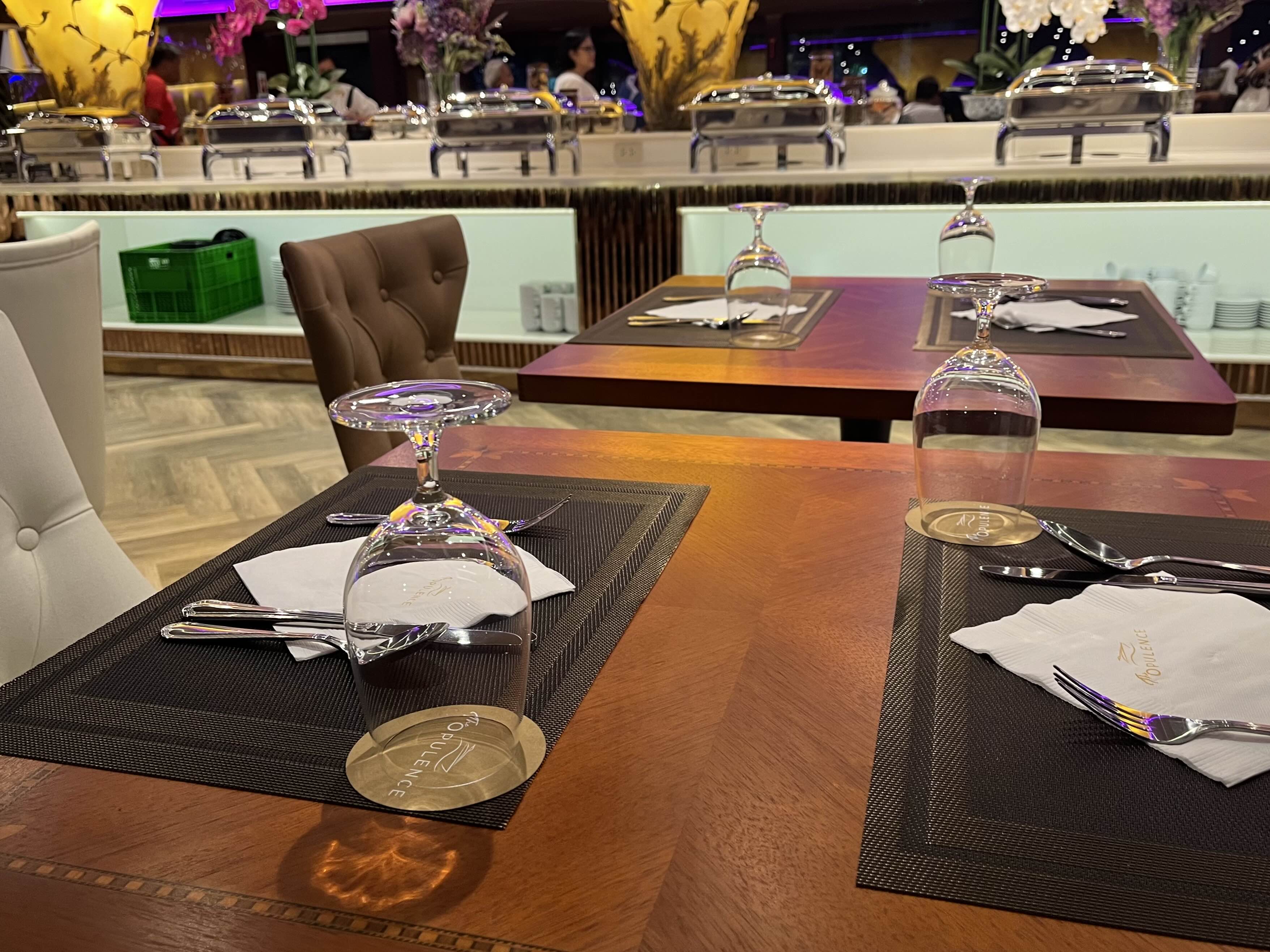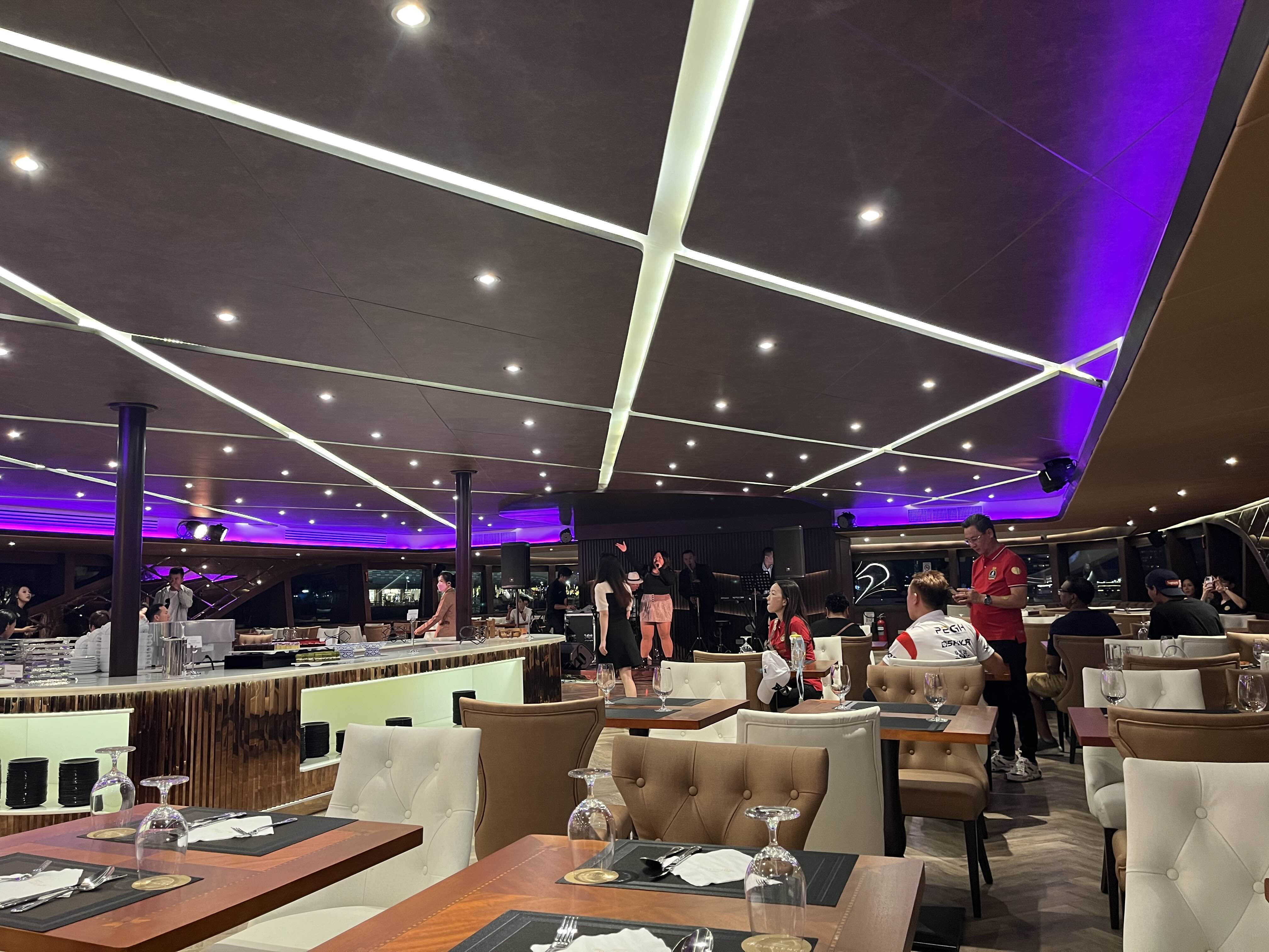 새로 오픈한 크루즈라 내부는 굉장히 깨끗하고 좋았습니다. 좌석마다 식기들이 놓여 있고 특별 라이브 무대도 구경하실 수 있어요.