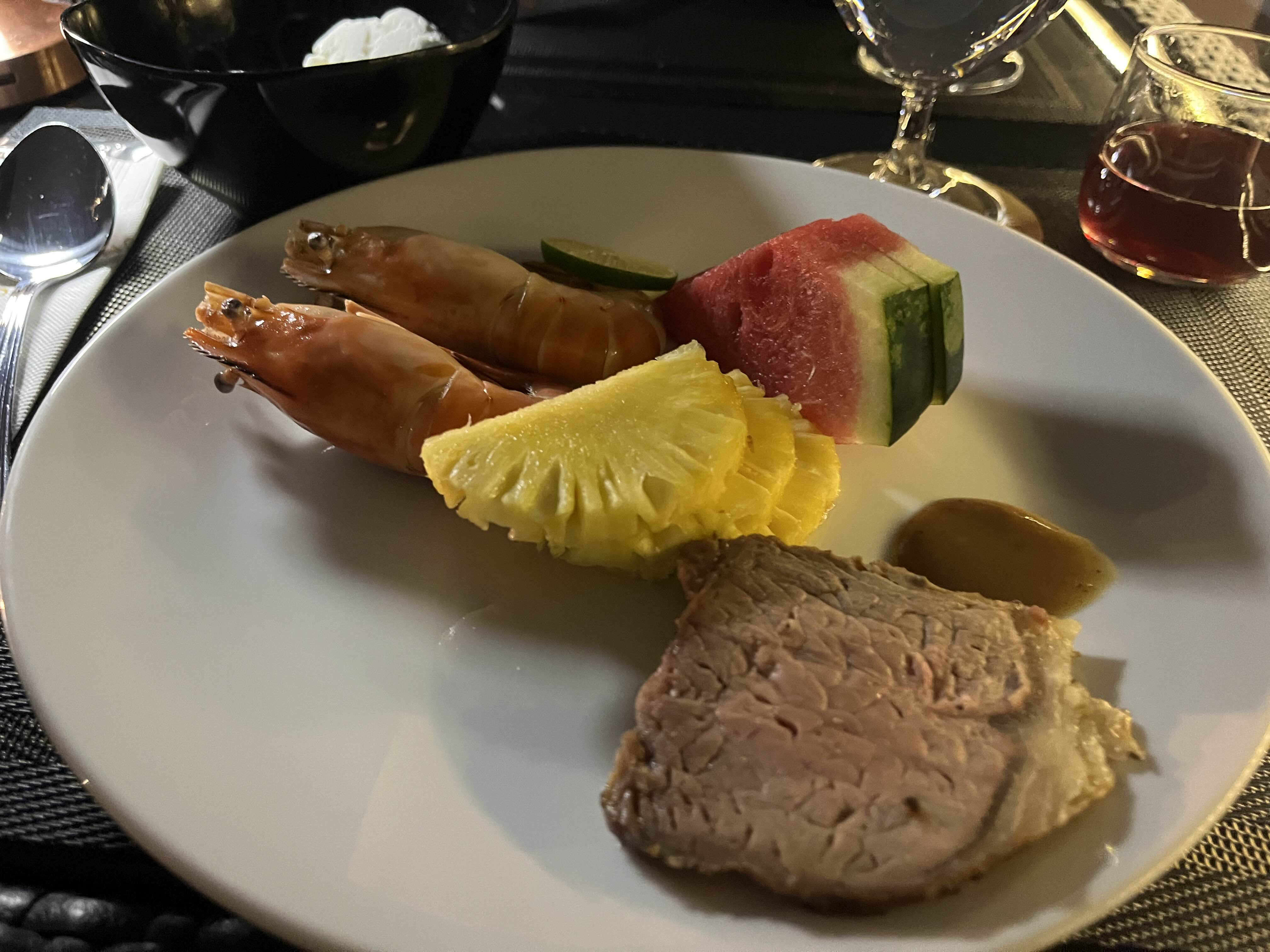 제가 담은 음식들과 주문한 음료인데요 저희는 수박주스, 파인애플주스, 오렌지주스 세 잔 시켜봤는데 하트 모양의 파인애플을 데코로 해주셔서 사진 남겨봤어요. 음식들은 전반적으로 깔끔하면서 맛있었고, 스테이크만 살짝 질겼던 것 같아요. 새우는 정말 맛있습니다. 꼭 드세요.