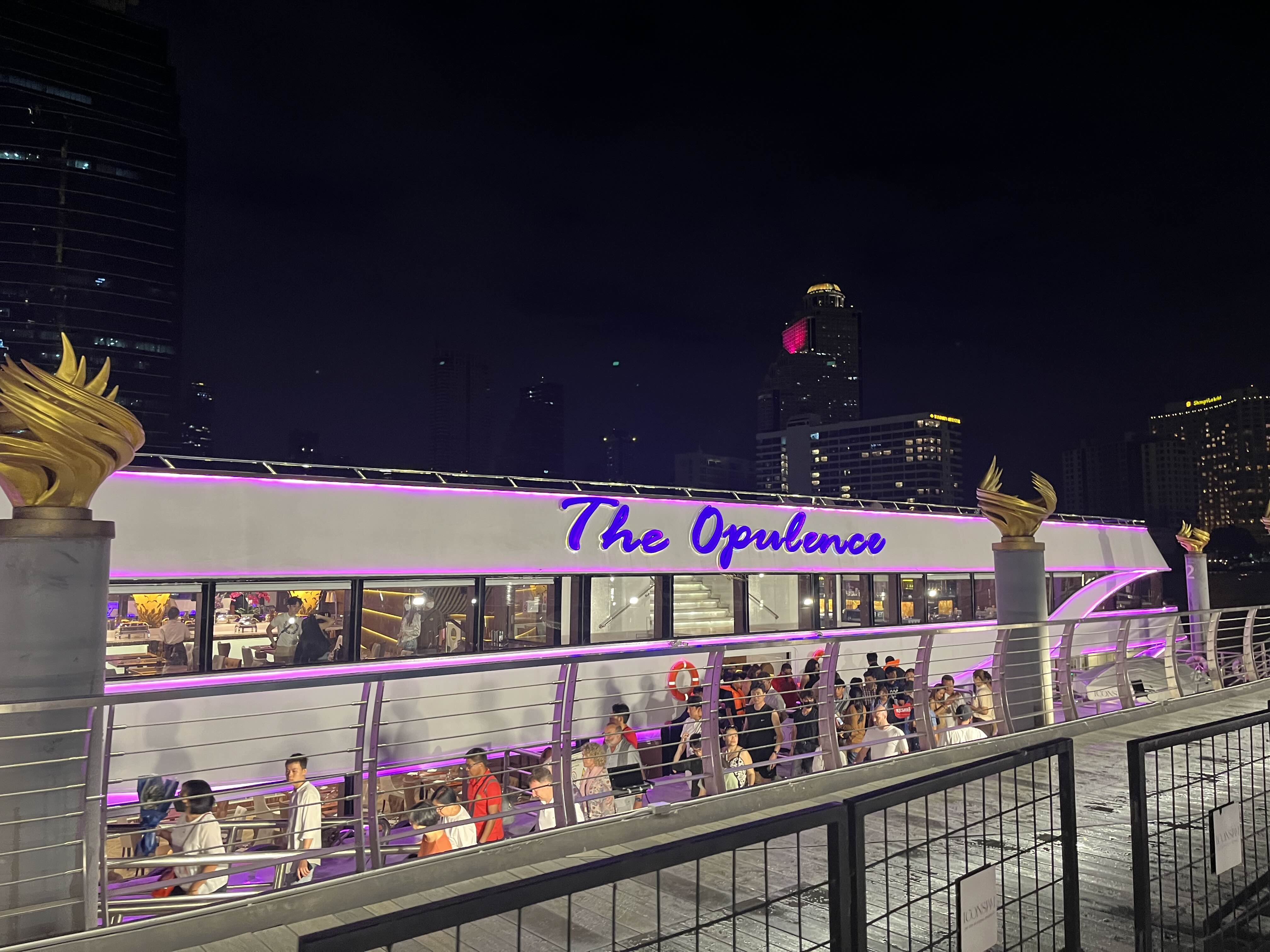 화려한 오퓰런스 크루즈 외관입니다. 디너크루즈는 차오프라야강 선상에서 방콕의 랜드마크를 볼 수 있어서 좋은데요 중요한 장소로는 왓아룬, 왓포, 왕궁, 라마 8세 다리, 아시아티크 등이 있습니다. 2시간 동안 방콕 시티의 야경을 다양하게 즐길 수 있어요.