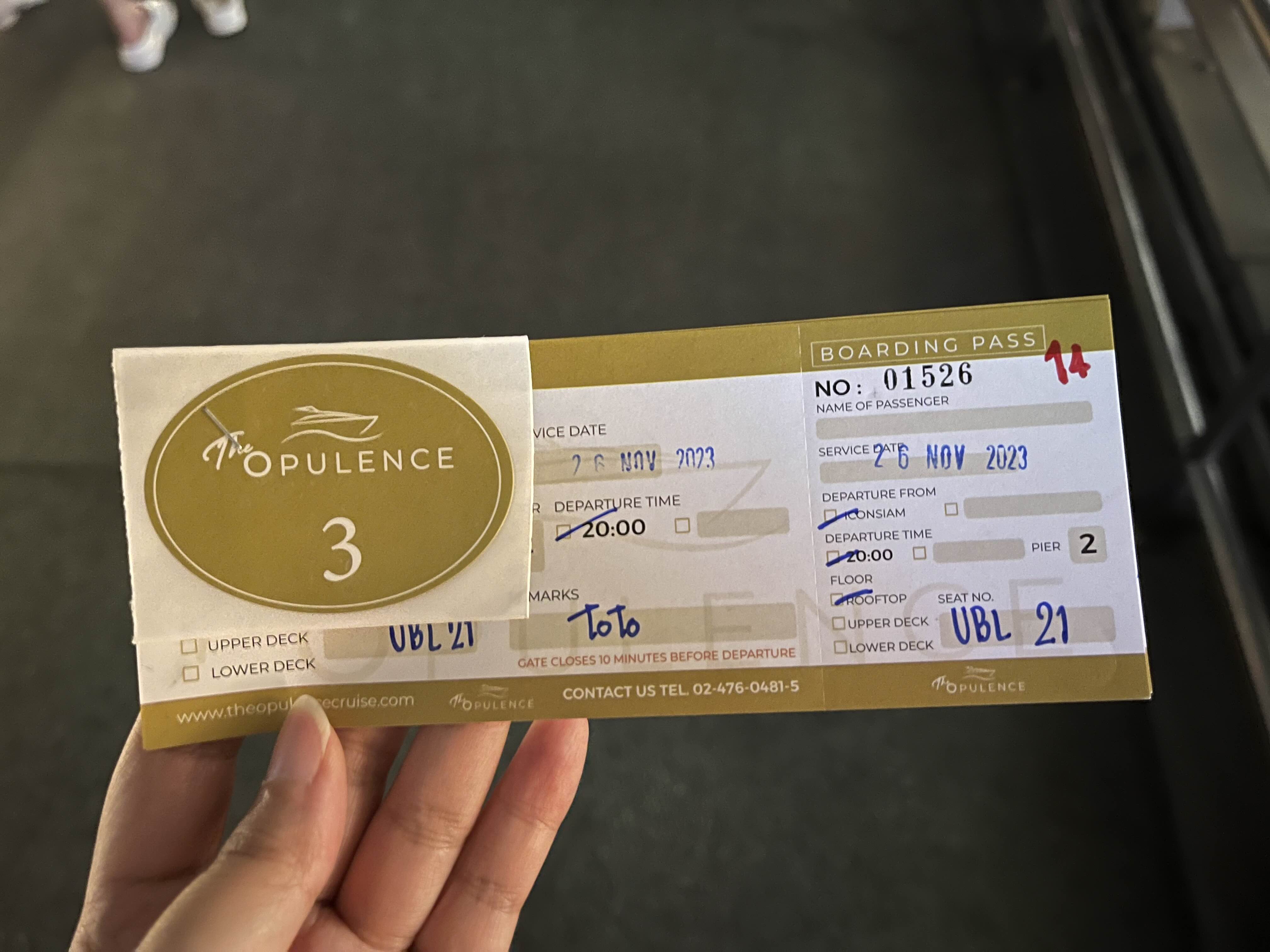오퓰런스 크루즈 직원분들이 티켓 교환을 위해 기다려주시는데 티켓과 옷에 붙이는 스티커를 줍니다. 저희는 3층 야외석으로 예약을 해서 3번 스티커를 받았어요.