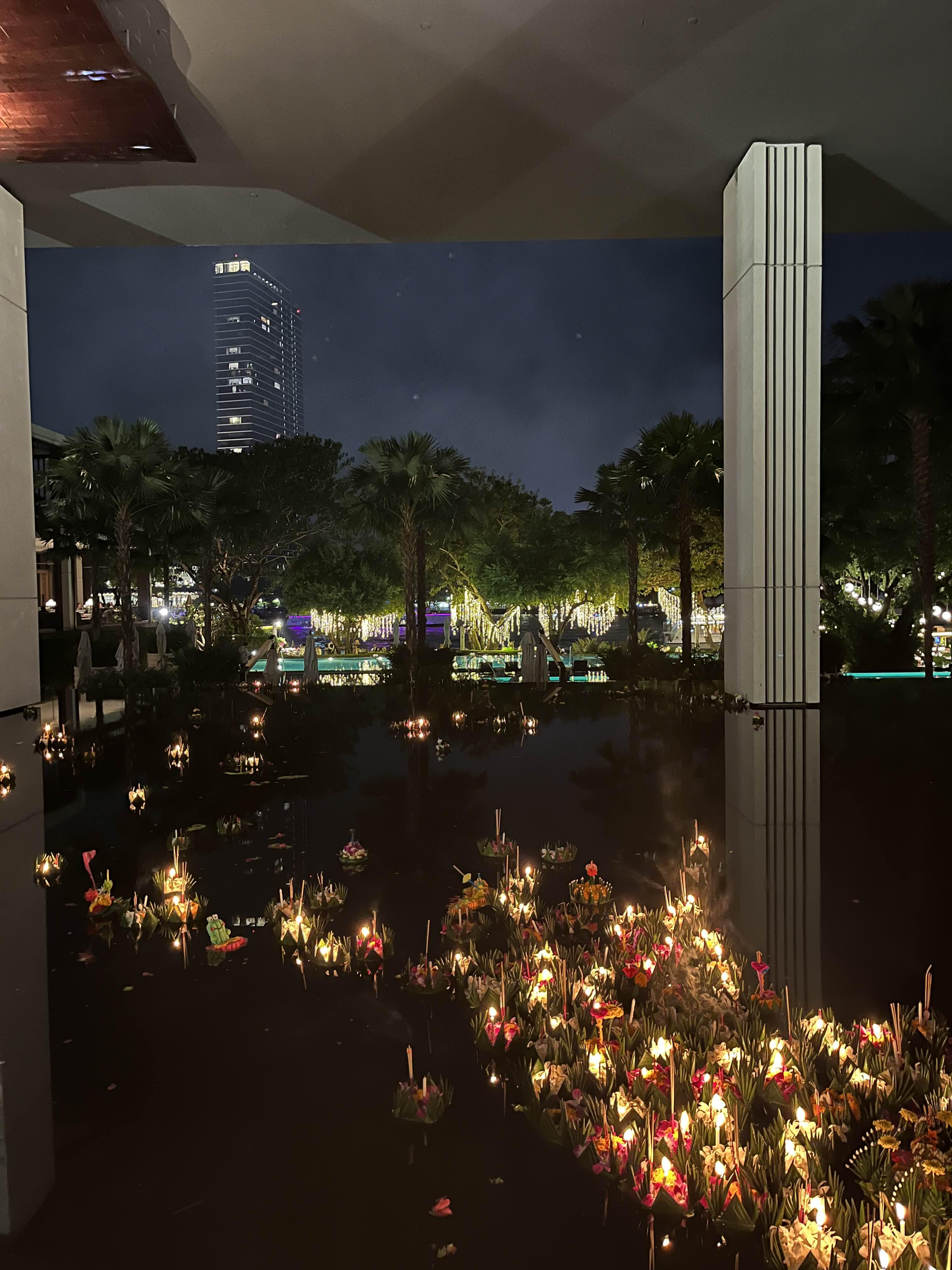 위에서 언급했던 끄라통에 촛불을 붙인 모습입니다. 호텔 내에서 직원분이 친절하게 불을 붙여 주시고 저는 물 위로 띄우기만 했어요. 작은배와 촛불 모습이 너무 예쁘죠.
