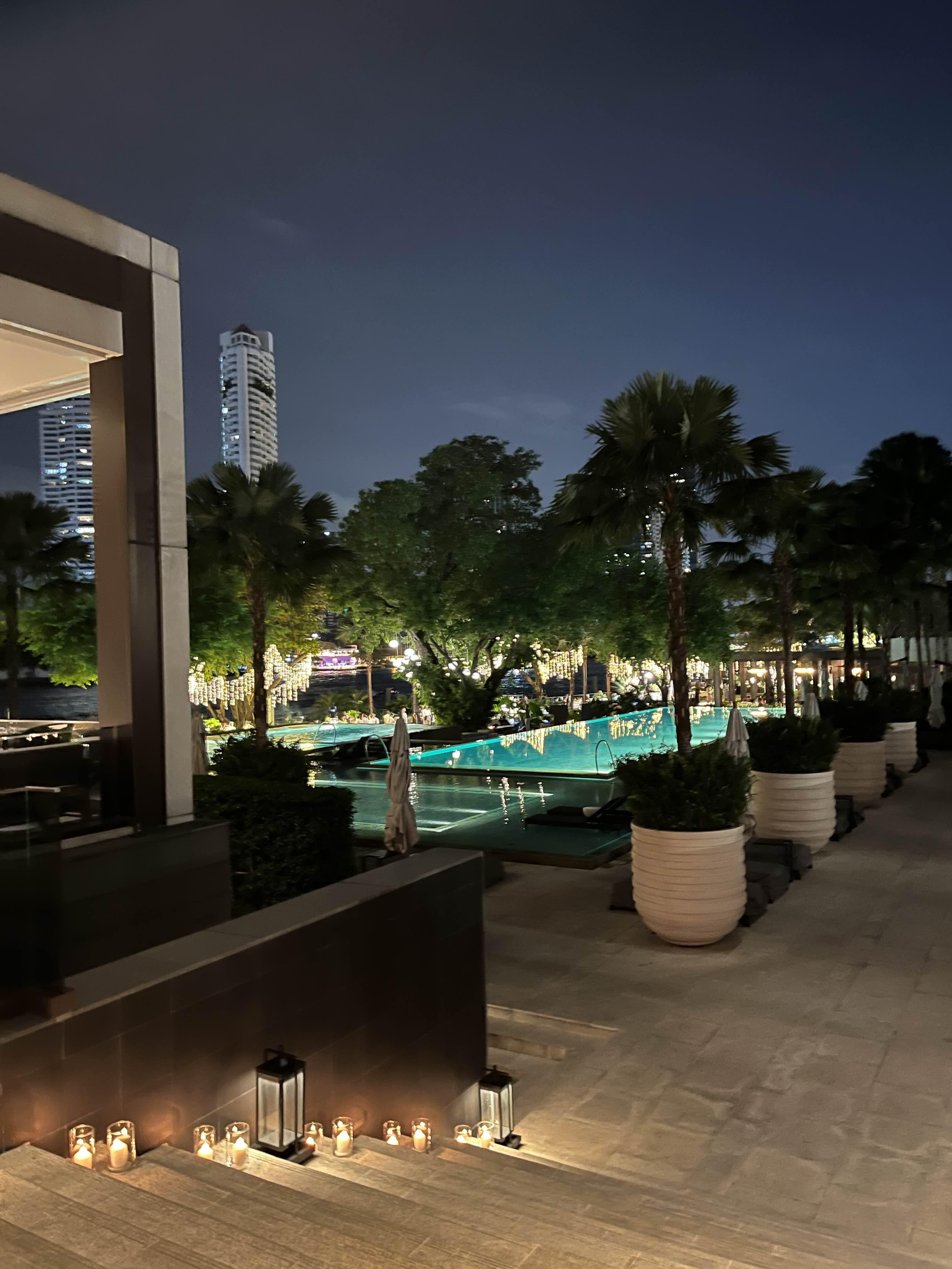 리바델피우메는 호텔 안쪽으로 걸어들어오면 예쁜 수영장과 차오프라야강이 보이는 위치해 있는데요 야경이 정말 멋있었어요. 데이트로 와도 정말 좋을 것 같아요.