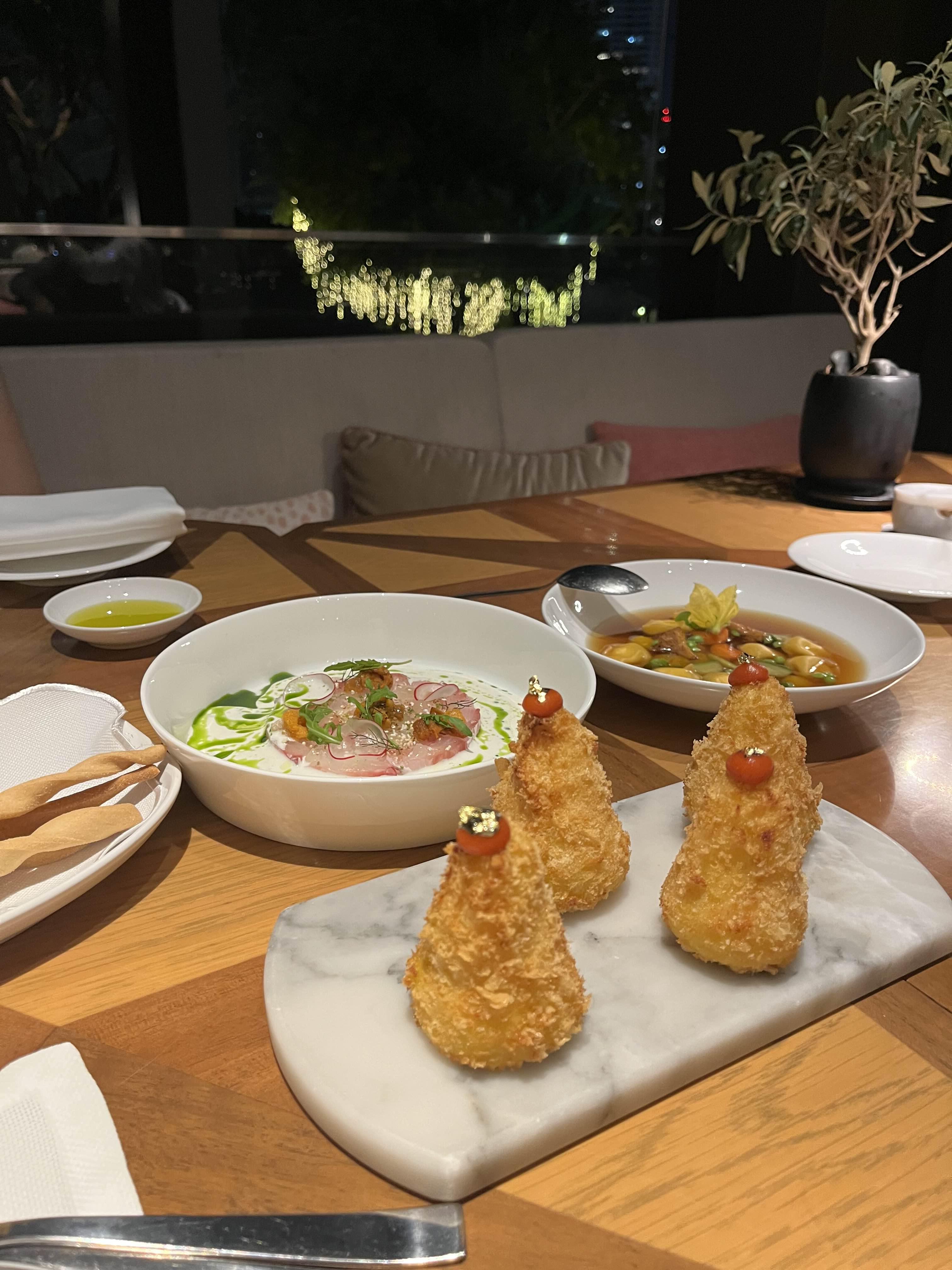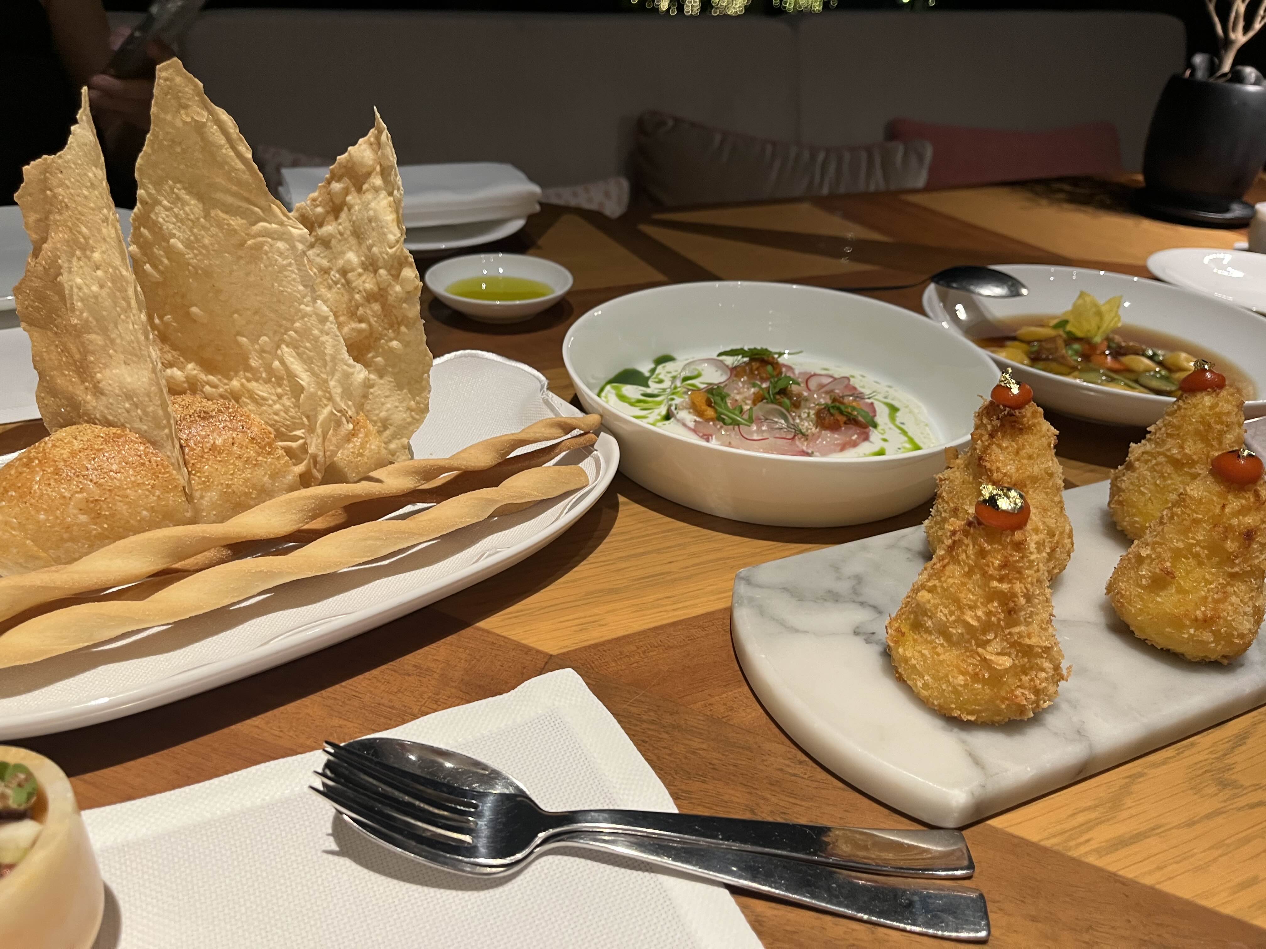 왼쪽에 있는 게 식전 빵과 어포인데요 플레이팅이 인상적이죠. 빵은 따뜻하게 데워져서 나왔고 같이 준비해 준 신선한 올리브 오일에 찍어 먹으니 맛있었습니다.