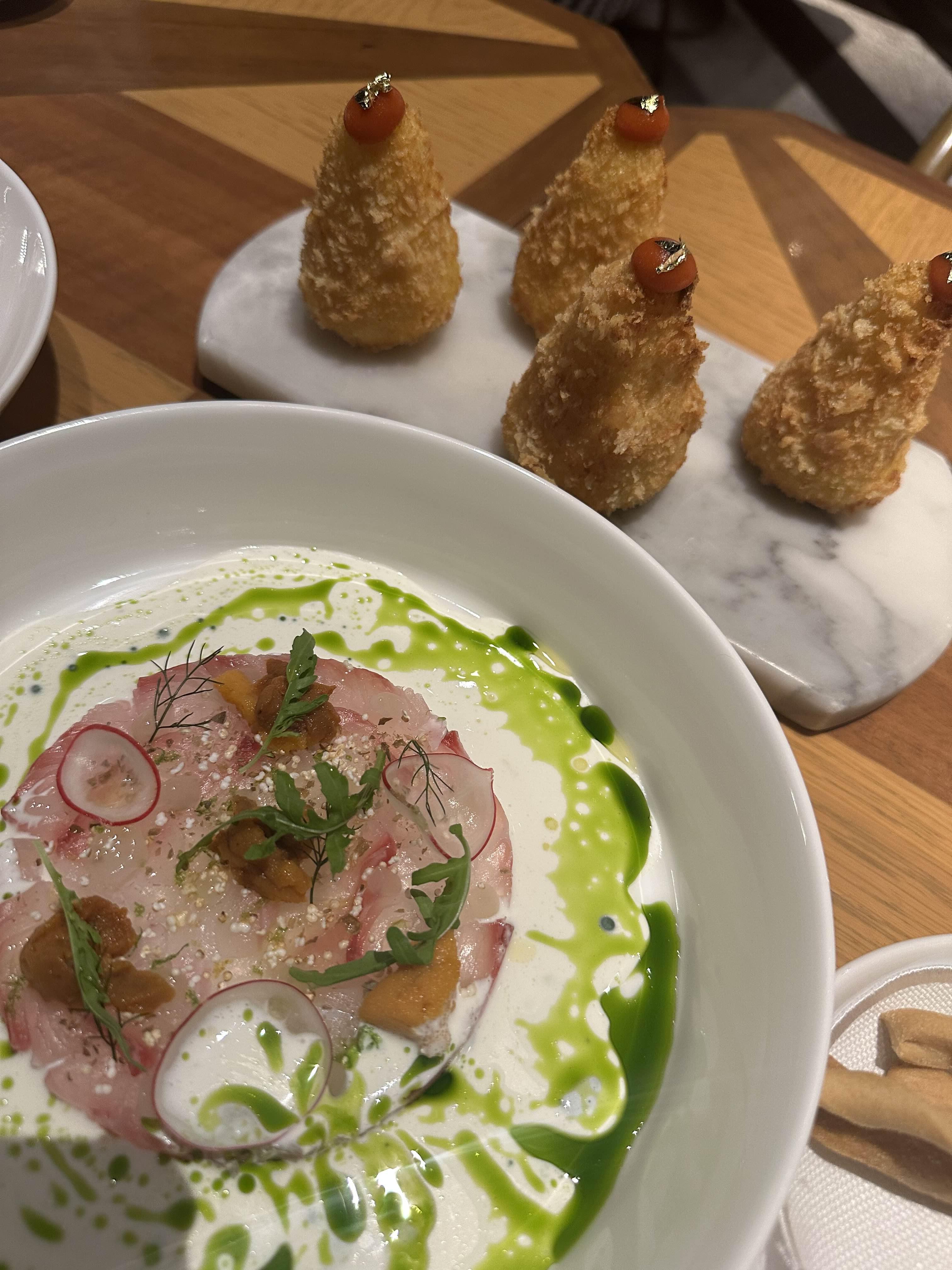 아란치니는 밥이 들어간 튀김인데요 동그란 모양이 아닌 삼각뿔 모양의 작고 귀여운 모습입니다. 금박 장식도 너무 예쁘네요.