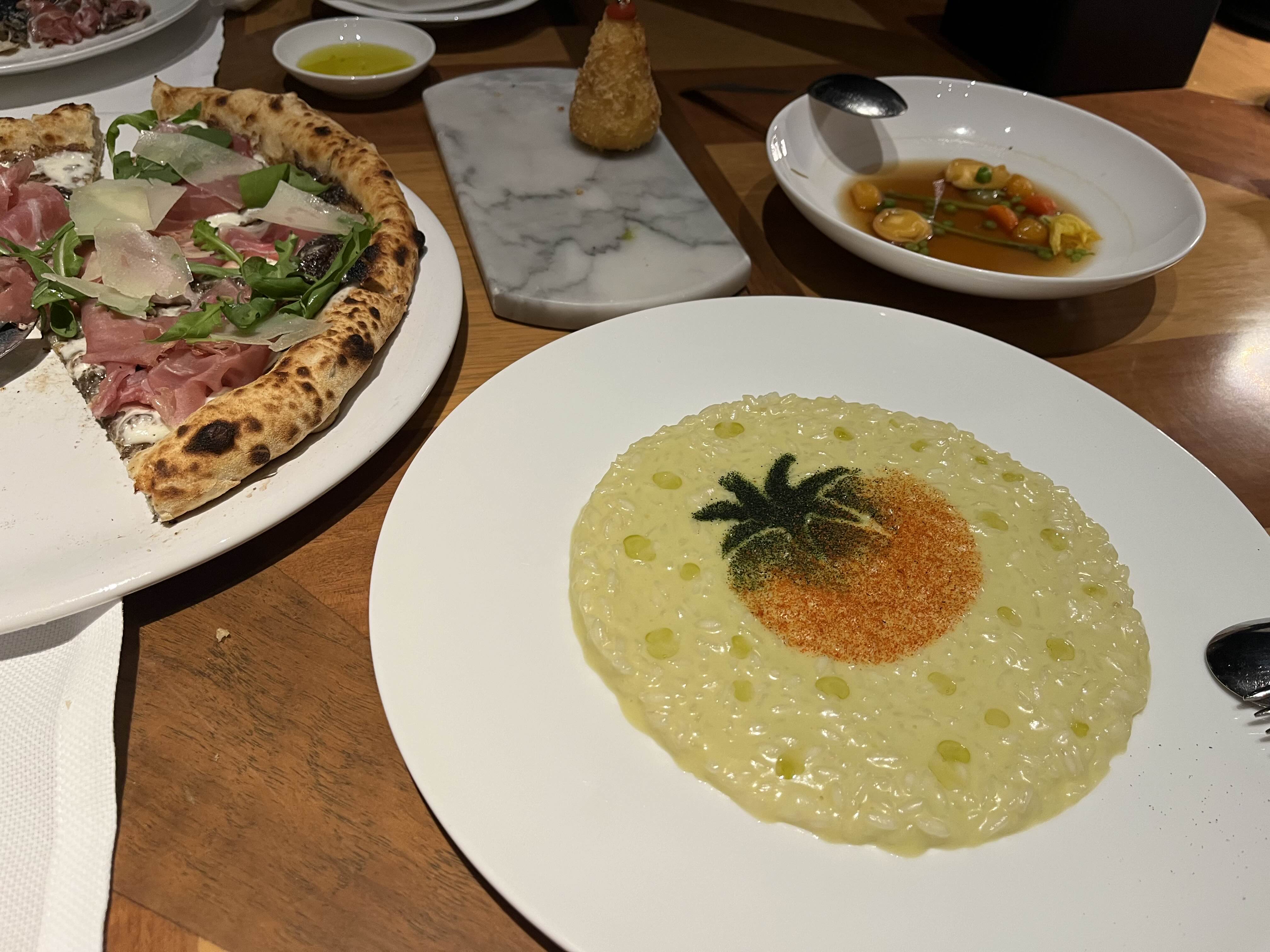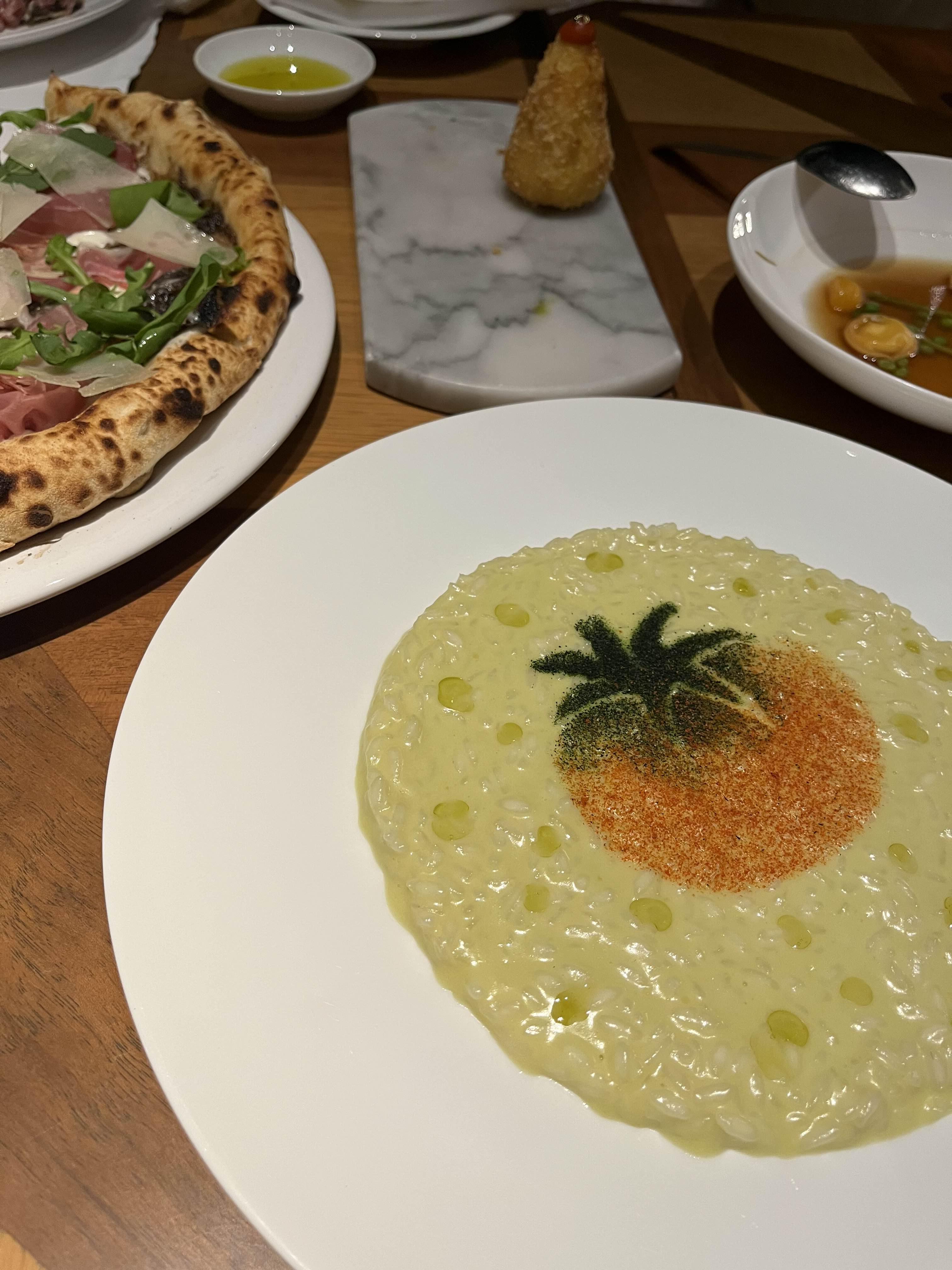 토마토가 그려진 귀여운 리조또입니다. 색은 초록빛이 나는데 로비올라 치즈를 사용해서 인지 치즈맛이 강하게 났습니다. 리조또를 알단테로 조리를 한건지 살짝 덜 익은 느낌이었고 맛은 무난한 편이었던 것 같네요.